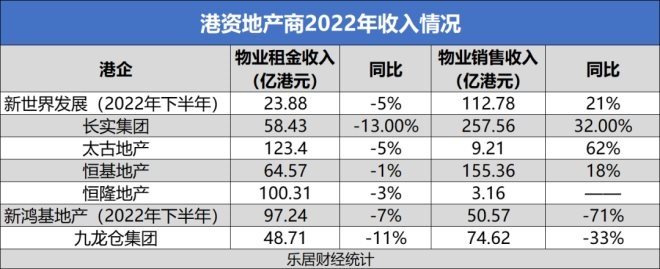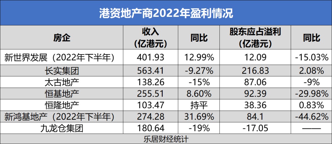 從表格上看,除了九龍倉集團(tuán)于2022年實(shí)現(xiàn)股東應(yīng)占溢利虧損17.05億港元以外,長實(shí)集團(tuán)、新世界發(fā)展、恒基地產(chǎn)等幾家港資地產(chǎn)巨頭均保持正向盈利。