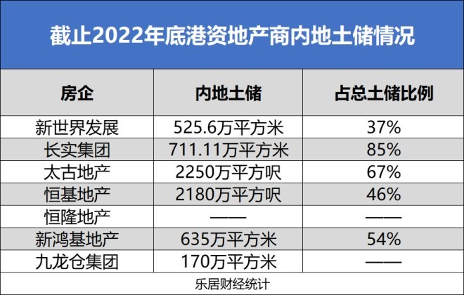 從幾個(gè)港資地產(chǎn)商的土儲(chǔ)來看,目前內(nèi)地土儲(chǔ)仍占據(jù)較大的比例,像是長實(shí)集團(tuán)內(nèi)地土儲(chǔ)711.11萬平方米,占總土儲(chǔ)比例85%,而太古地產(chǎn)內(nèi)地土儲(chǔ)2250萬平方呎,占比67%。