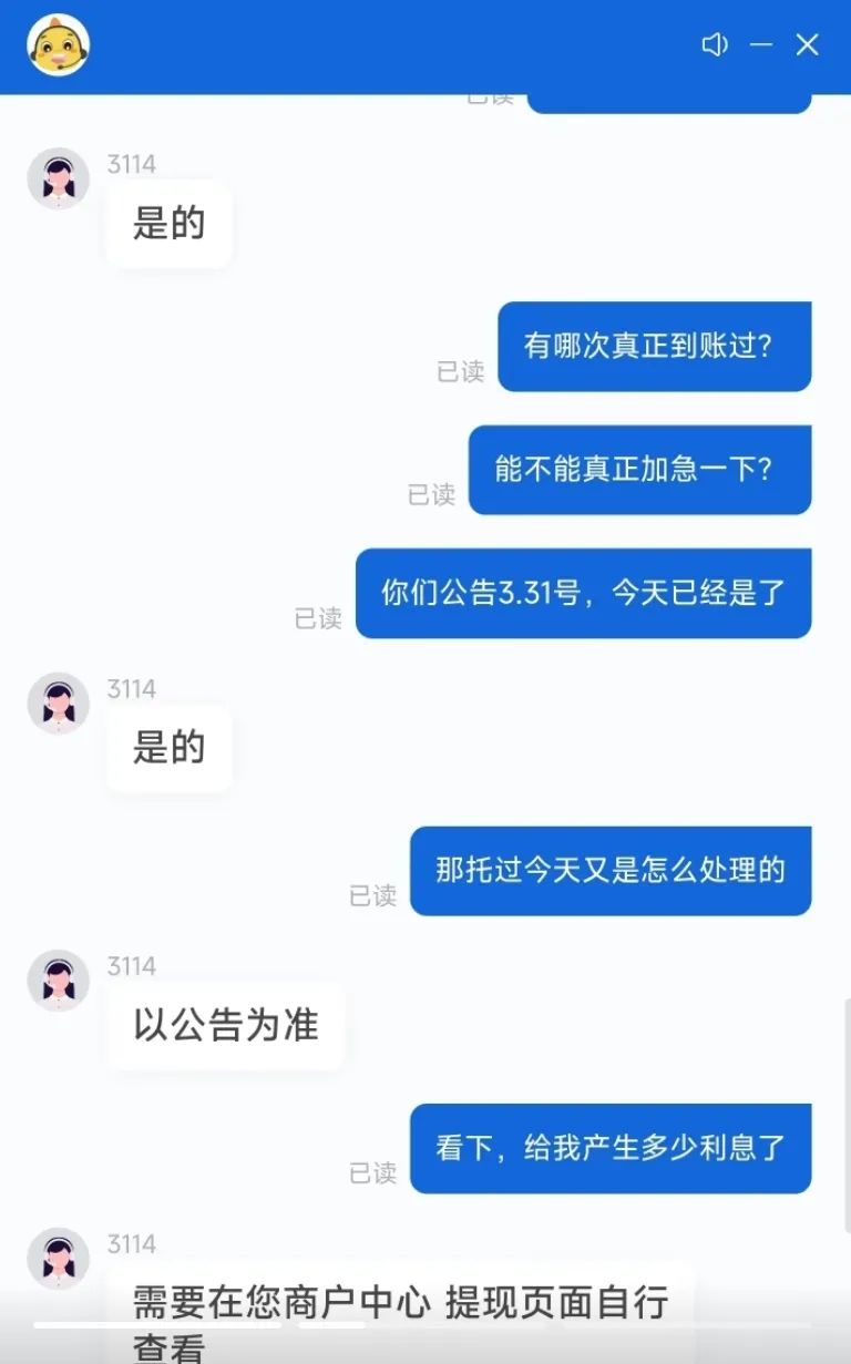 但是得到的回復(fù)不是“幫你加急或者催業(yè)務(wù)員”,就是“需要您在商戶(hù)中心提現(xiàn)頁(yè)面自行查看”“以新公告為準(zhǔn)”。
