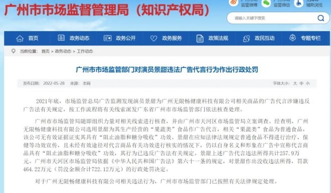 2022年5月,據(jù)廣州市監(jiān)局官網(wǎng)信息顯示,景甜因違法廣告代言被罰沒722萬元。據(jù)《中華人民共和國(guó)廣告法》第三十八條第三款規(guī)定,“對(duì)在虛假?gòu)V告中作推薦、證明受到行政處罰未滿三年的自然人、法人或者其他組織,不得利用其作為廣告代言人!币簿驼f,景甜3年內(nèi)將不能代言廣告(詳情見青眼號(hào)外文章《3年不得代言!又一明星翻車了》)。