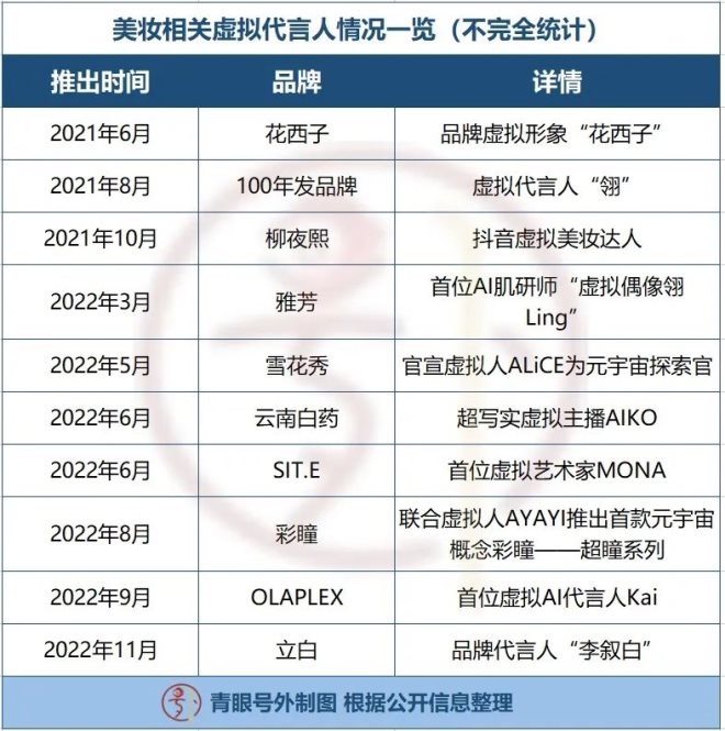 比如部分品牌開始更偏向于使用虛擬代言人,如花西子發(fā)布虛擬形象“花西子”,100年潤(rùn)發(fā)品牌官宣虛擬代言人“翎”,雅芳官宣首位AI肌研師,立白宣布“李敘白”為其首位虛擬數(shù)字代言人等。