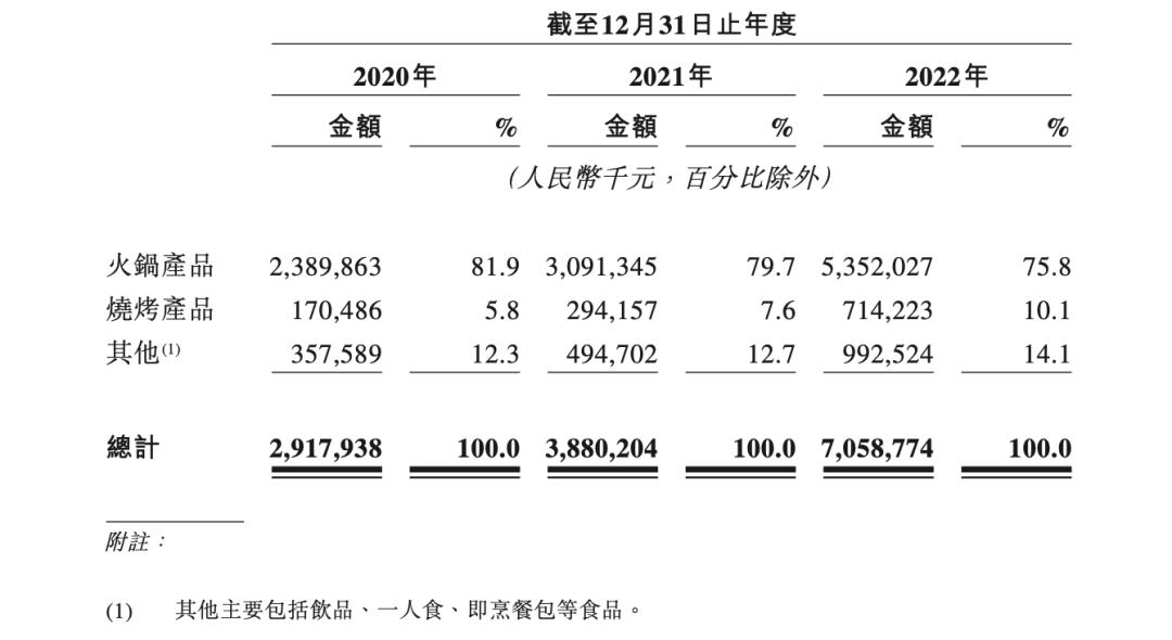 其中,2020年至2022年鍋圈火鍋產(chǎn)品的收入占比分別為81.9%、79.7%、75.8%;同期,燒烤產(chǎn)品的收入占比分別為5.8%、7.6%、10.1%。2022年,火鍋產(chǎn)品實(shí)現(xiàn)收入53.52億元,燒烤產(chǎn)品實(shí)現(xiàn)收入7.14億元,其他產(chǎn)品實(shí)現(xiàn)收入9.92億元。