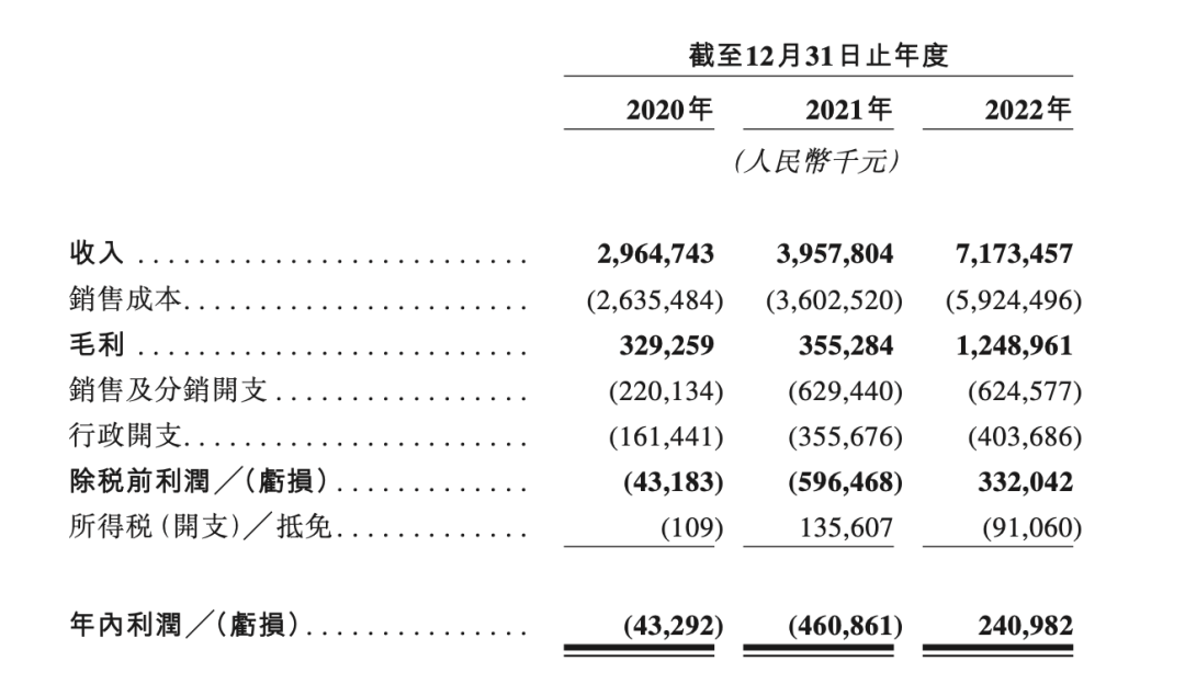業(yè)績(jī)方面,據(jù)鍋圈招股書披露,2020年至2022年公司營(yíng)收分別為29.6億元、39.6億元以及71.7億元,累計(jì)達(dá)141億元;2020年至2022年毛利潤(rùn)分別為3.3億元、3.6億元以及12.5億元,毛利率分別為11.1%、9.0%及17.4%。