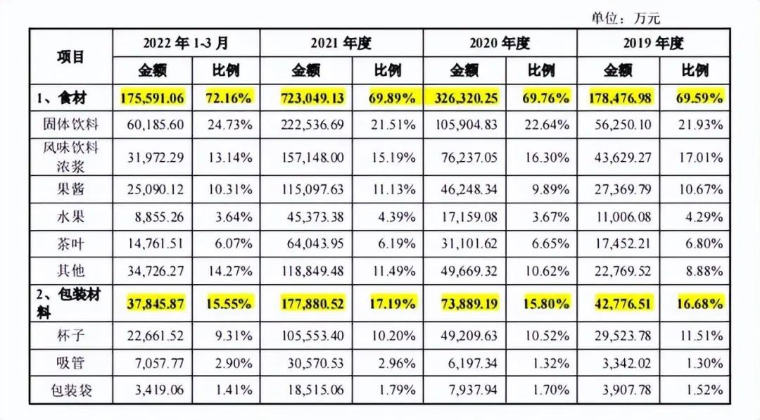 招股書顯示,從2019年到2022年前三個(gè)月,蜜雪冰城最大的營收來源便是食材和包裝材料的收入,在蜜雪冰城主營業(yè)務(wù)收入中分別占比86.2%、85.5%、87%和87.7%,幾乎接近九成。