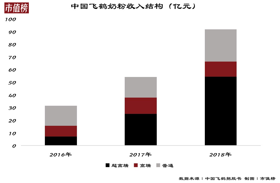 飛鶴奶粉產(chǎn)品有超高端、高端和普通奶粉產(chǎn)品,其中超高端產(chǎn)品一直是飛鶴主要收入來源,招股書顯示2016年到2019年,飛鶴的超高端產(chǎn)品一直占到飛鶴收入的一半左右,再輔以差異化的產(chǎn)品及營銷覆蓋更廣的消費群體。