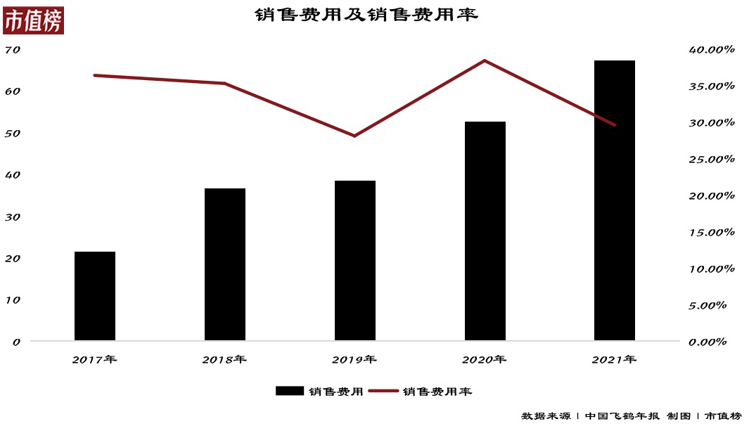 早在2013年,飛鶴就開始在央視進行廣告投放,費用達3億元。甚至在2016年凈利潤僅2.69億元的情況下,依舊花費了5.5億元在廣告投放上。而2017年到2021年,飛鶴5年花在銷售及經(jīng)銷費用上的錢,總額有200億元。
