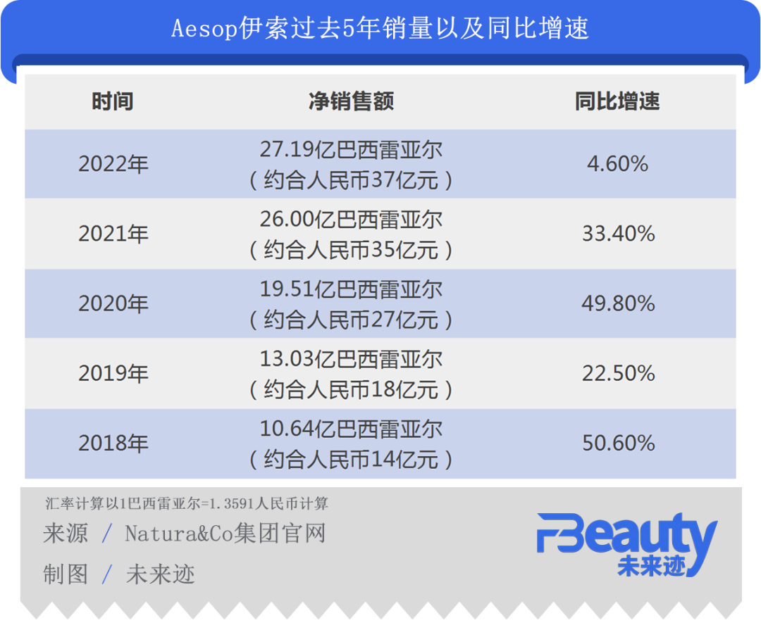 從Aesop伊索的業(yè)績(jī)表現(xiàn)來(lái)看,據(jù)《FBeauty未來(lái)跡》統(tǒng)計(jì),自Aesop伊索被Natura&Co集團(tuán)收購(gòu)后,其營(yíng)收平均每年保持20%以上的增長(zhǎng)。財(cái)報(bào)顯示,2018—2022年,Aesop銷售額分別增長(zhǎng)了50.6%、22.5%、49.8%、33.4%、4.6%。