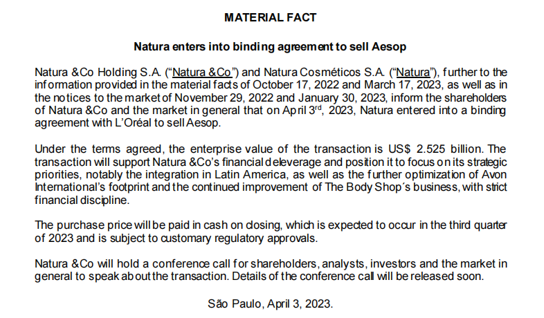 昨天(4月3日),巴西美妝巨頭Natura&Co集團(tuán)發(fā)布聲明稱,已和歐萊雅集團(tuán)簽署協(xié)議,將旗下Aesop伊索品牌以25.25億美元(約合人民幣173億元)的擬交易估價(jià),出售給歐萊雅集團(tuán)。該交易將采取現(xiàn)金支付的方式,預(yù)計(jì)將在2023年第三季度進(jìn)行。