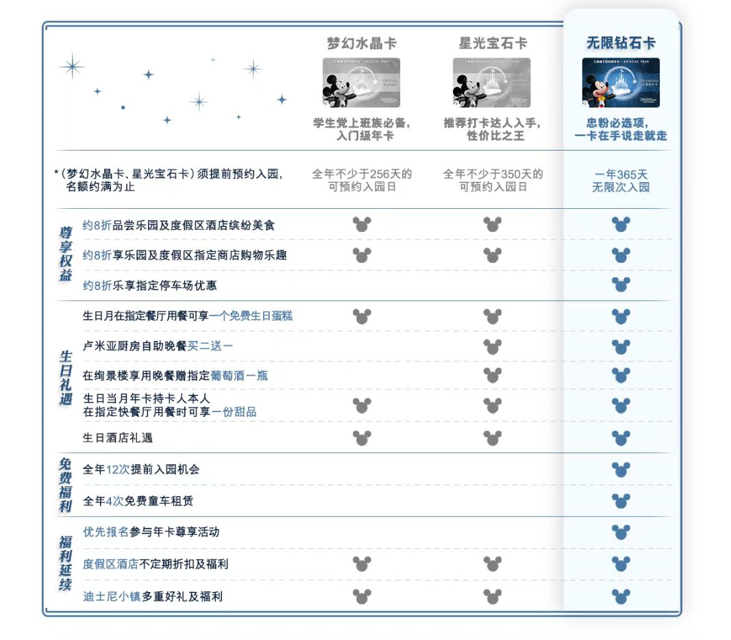 取消年卡意味著什么呢?一位辦理過上海迪士尼樂園年卡的用戶向開菠蘿財經(jīng)介紹,上海迪士尼的年卡分為夢幻水晶卡、星光寶石卡和無限鉆石卡三種,分別對應(yīng)著不同的優(yōu)惠,包括購物打折、提前入園、租賃童車、多次游玩機會等。如果是經(jīng)常去迪士尼的人,辦理年卡是非常合適的,一個月去一次,半年就回本了。