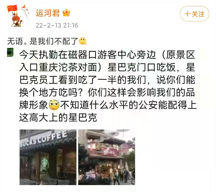 2022年2月,因認(rèn)為民警在店外客區(qū)就餐會(huì)影響品牌形象,重慶磁器口星巴克店員驅(qū)趕四位正在吃盒飯的民警。