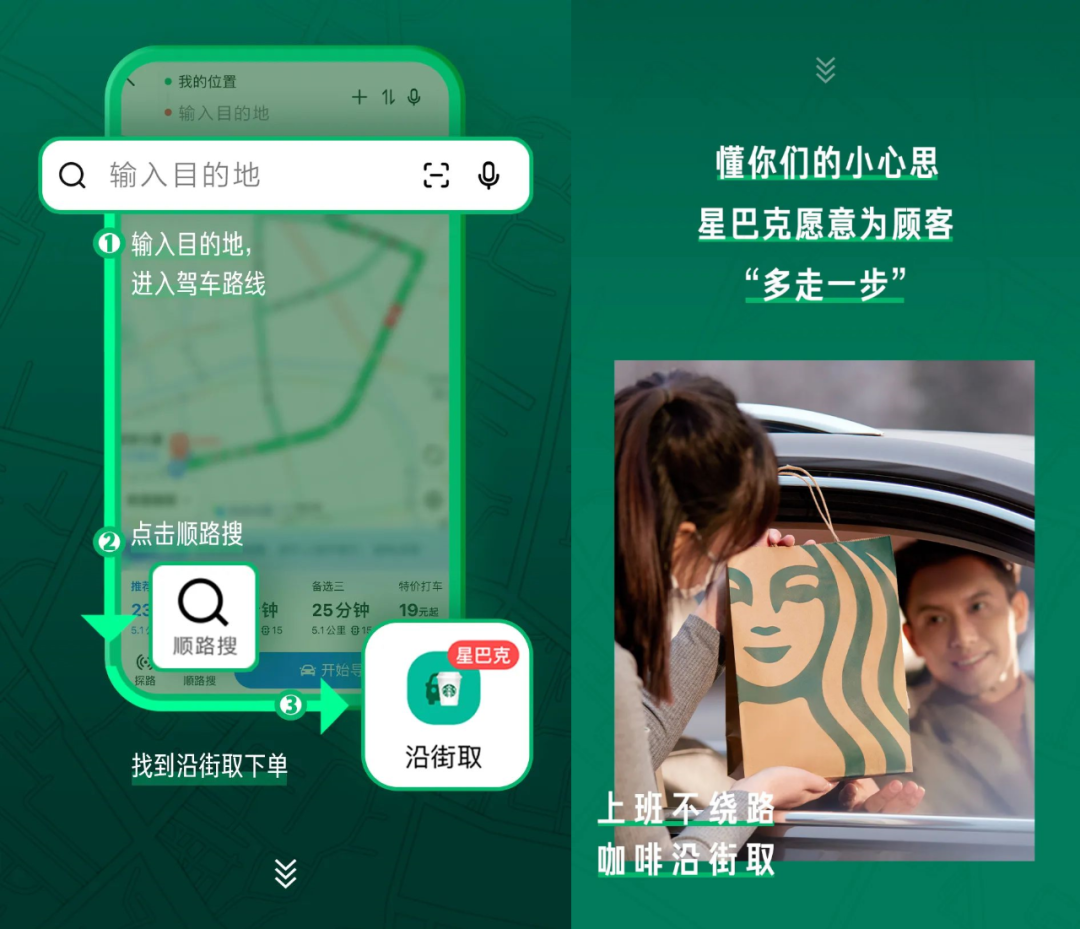 最近,星巴克在北京、上海率先推出了個(gè)“沿街取”的服務(wù)。簡(jiǎn)而言之,就是你在高德地圖上下單星巴克,只需要到達(dá)指定的位置,坐在車上就會(huì)有星巴克服務(wù)員將咖啡遞到你手上。