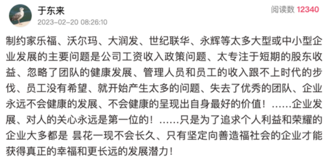 在此前聯(lián)商網(wǎng)主辦的“2023中國超市周”上,胖東來創(chuàng)始人于東來曾怒斥“加班”文化,他表示:“在胖東來,你加班就是不行。你加班就是占用別人成長機(jī)會(huì)。你剝奪別人的時(shí)間,學(xué)習(xí)機(jī)會(huì),創(chuàng)造機(jī)會(huì)。是什么概念呢?是不道德的!