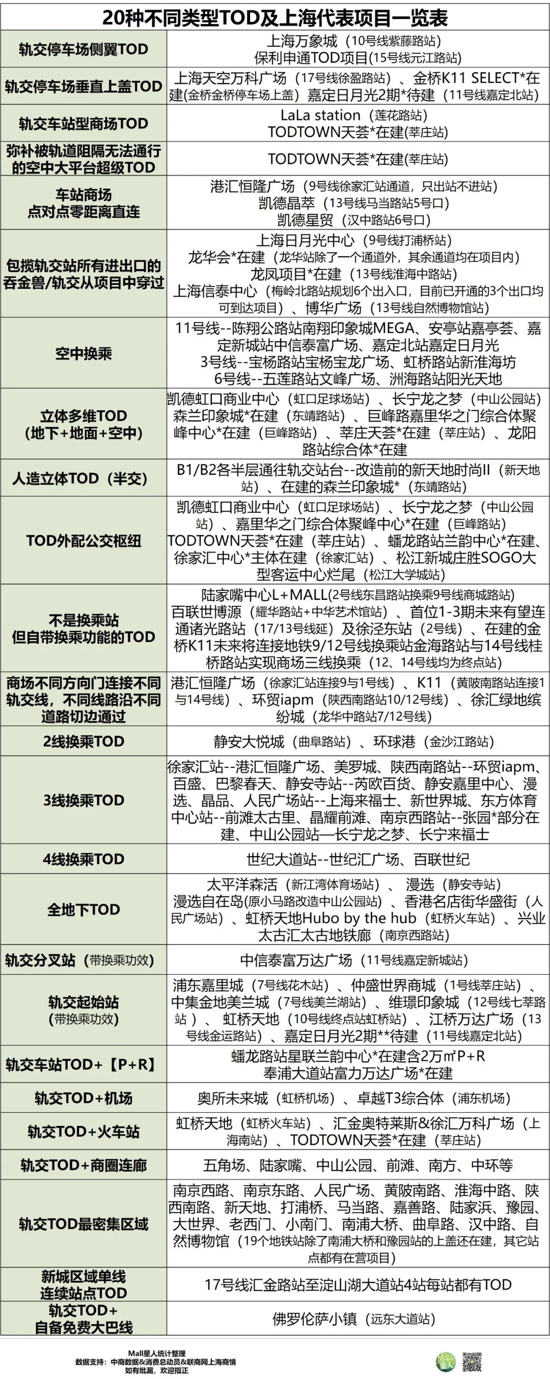 與此同時(shí),數(shù)量的大幅“通脹”也導(dǎo)致TOD商業(yè)價(jià)值有所縮水,到底哪些TOD項(xiàng)目最具價(jià)值成為Mall星人的研究課題。本文Mall星人將從數(shù)據(jù)視角分析上海TOD項(xiàng)目的公共性、創(chuàng)造性、特殊性、便利度和包容度。由于文章內(nèi)容較長(zhǎng),故分為上下兩期,本期將從不同類(lèi)型TOD項(xiàng)目?jī)r(jià)值視角,PK魔都20類(lèi)TOD,到底哪種類(lèi)型價(jià)值最大以及最具代表性(詳細(xì)表格解析見(jiàn)文末);下期將圍繞項(xiàng)目視角,趣談上海各種TOD項(xiàng)目之最以及最多元素、最具潛力價(jià)值的TOD商業(yè)明星榜,敬請(qǐng)期待。