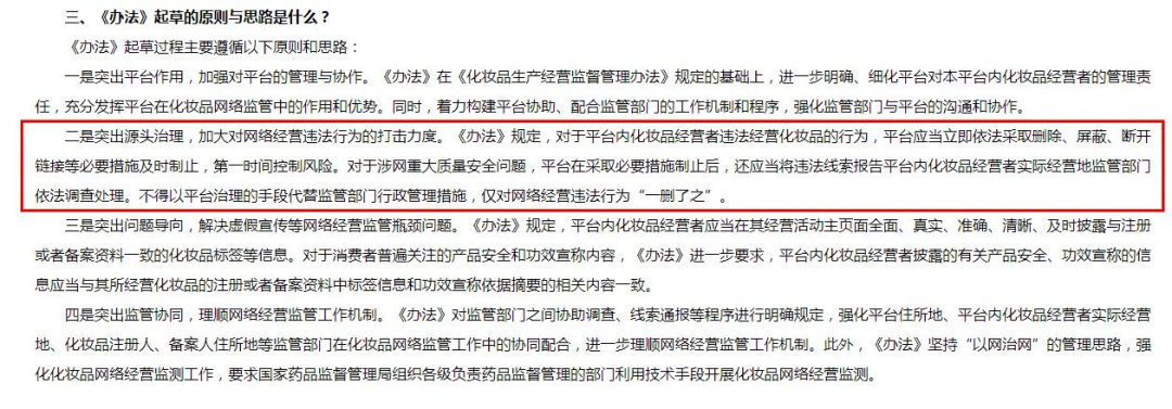 此外,對于涉網(wǎng)重大質(zhì)量安全問題,平臺在采取必要措施制止后,還應(yīng)當(dāng)將違法線索報(bào)告平臺內(nèi)化妝品經(jīng)營者實(shí)際經(jīng)營地監(jiān)管部門依法調(diào)查處理。國家藥監(jiān)局在解讀《辦法》時(shí)強(qiáng)調(diào),“不得以平臺治理的手段代替監(jiān)管部門行政管理措施,僅對網(wǎng)絡(luò)經(jīng)營違法行為‘一刪了之’!