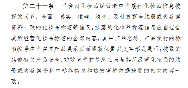 對于消費(fèi)者普遍關(guān)注的產(chǎn)品安全和功效宣稱內(nèi)容,《辦法》進(jìn)一步要求,平臺內(nèi)化妝品經(jīng)營者披露的有關(guān)產(chǎn)品安全、功效宣稱的信息應(yīng)當(dāng)與其所經(jīng)營化妝品的注冊或者備案資料中標(biāo)簽信息和功效宣稱依據(jù)摘要的相關(guān)內(nèi)容一致。