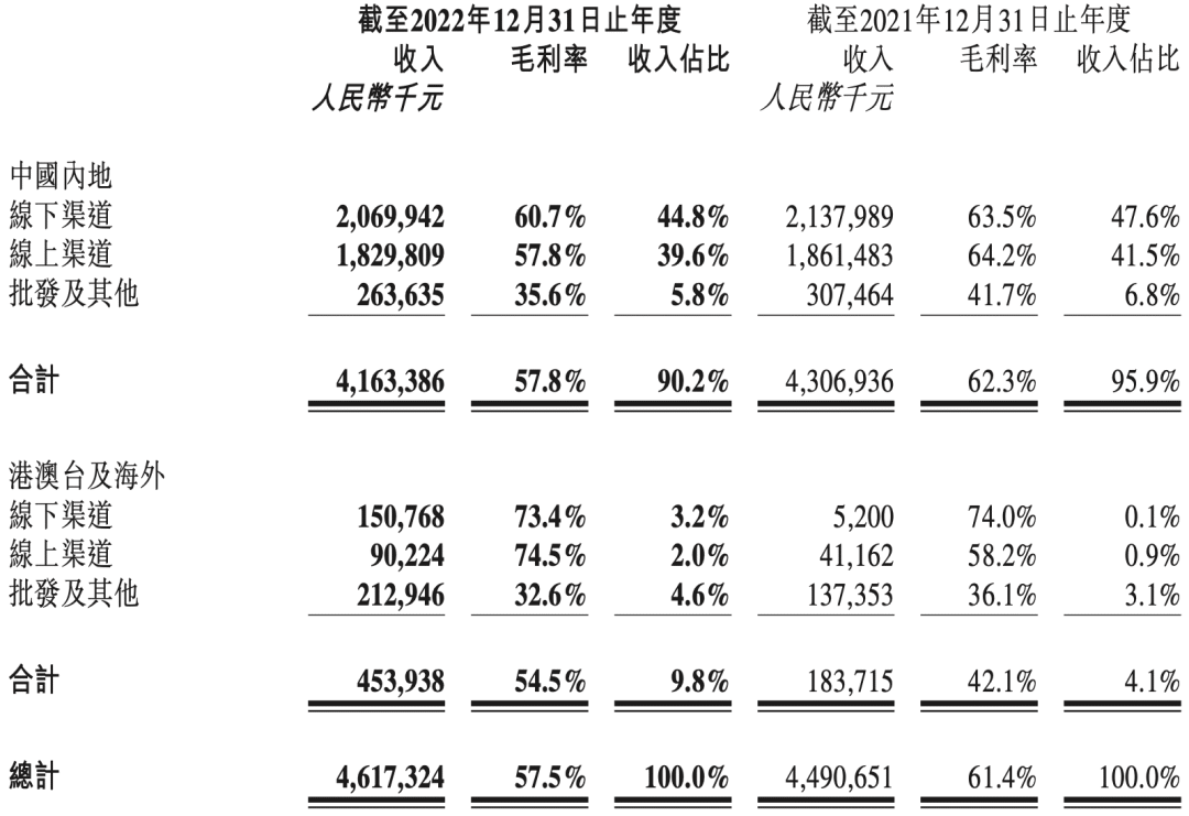 泡泡瑪特2022年度財(cái)報(bào)數(shù)據(jù)中,矚目的信號(hào)是線下渠道布局上的受挫。2022年,泡泡瑪特在中國(guó)內(nèi)地的營(yíng)收依舊主要來(lái)自線下,占比達(dá)44.8%,并出現(xiàn)了負(fù)增長(zhǎng),低于2021年度的47.6%。