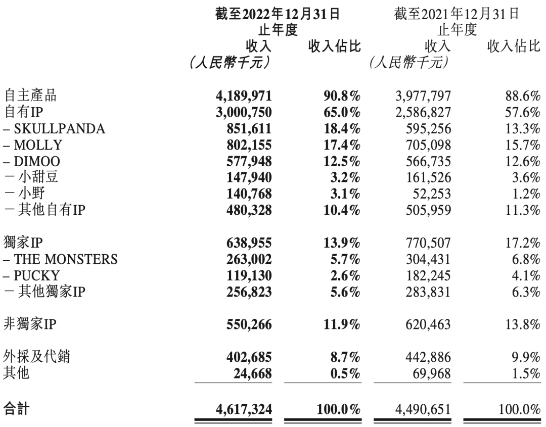 但原本一度被視為第二大IP的PUCKY,收入貢獻(xiàn)和營(yíng)收占比大幅下降,連帶著獨(dú)家IP的收入同比下降17.1%,收入占比下降至13.9%,幾乎與非獨(dú)家IP持平。與此同時(shí),新IP小野雖然在聲量上表現(xiàn)不俗,但營(yíng)收占比僅有3%。