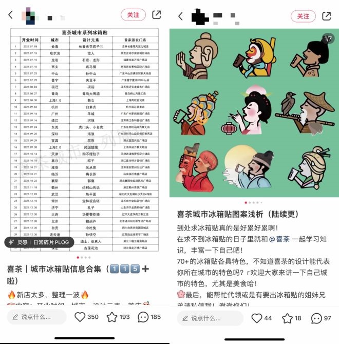 許多收藏喜茶城市冰箱貼的網(wǎng)友表示,有地域特色是其“入坑”的主要原因。這種特色也衍生出各地網(wǎng)友對喜茶冰箱貼中城市元素的討論。更有網(wǎng)友自發(fā)統(tǒng)計和分享喜茶城市冰箱貼相關(guān)的城市科普內(nèi)容,誕生了如《喜茶城市冰箱貼信息合集》等互動量過千的高熱帖。有網(wǎng)友表示,通過喜茶冰箱貼才知道了《西游記》作者吳承恩是淮安人、麗水盛產(chǎn)“菌中皇后”長裙竹蓀、駐馬店是“盤古開天辟地”傳說發(fā)源地等“知識點”。