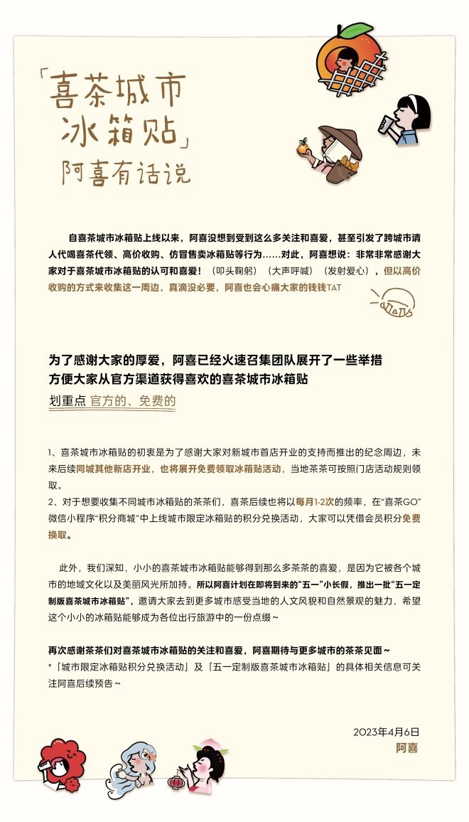喜茶回應(yīng)冰箱貼收藏熱:已展開舉措增加官方領(lǐng)取方式