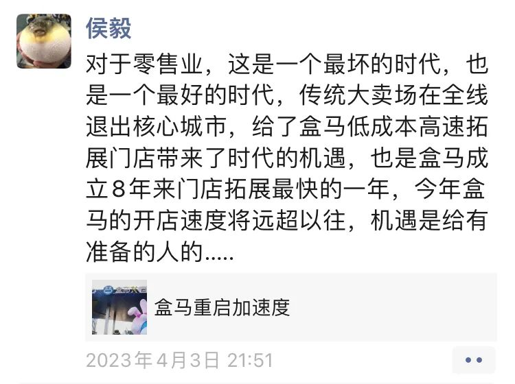 4月3日,侯毅在朋友圈解釋了盒馬的“異動(dòng)”:“對(duì)于零售業(yè),這是一個(gè)最壞的時(shí)代,也是一個(gè)最好的時(shí)代,傳統(tǒng)大賣場(chǎng)在全線退出核心城市,給了盒馬低成本高速拓展門店帶來了時(shí)代的機(jī)遇,也是盒馬成立8年來門店拓展最快的一年,今年盒馬的開店速度將遠(yuǎn)超以往,機(jī)遇是給有準(zhǔn)備的人的……”