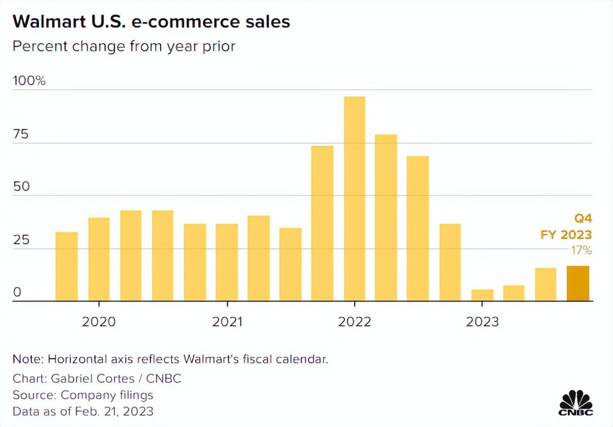 在沃爾瑪多年來的不斷努力下,目前電商已成為沃爾瑪業(yè)務(wù)中非常重要的一部分。根據(jù)上一個季度財報顯示,沃爾瑪在美國的在線銷售額占總銷售額的534億美元,同比上漲了17%,而同期亞馬遜的在線銷售額下降了2.3%。