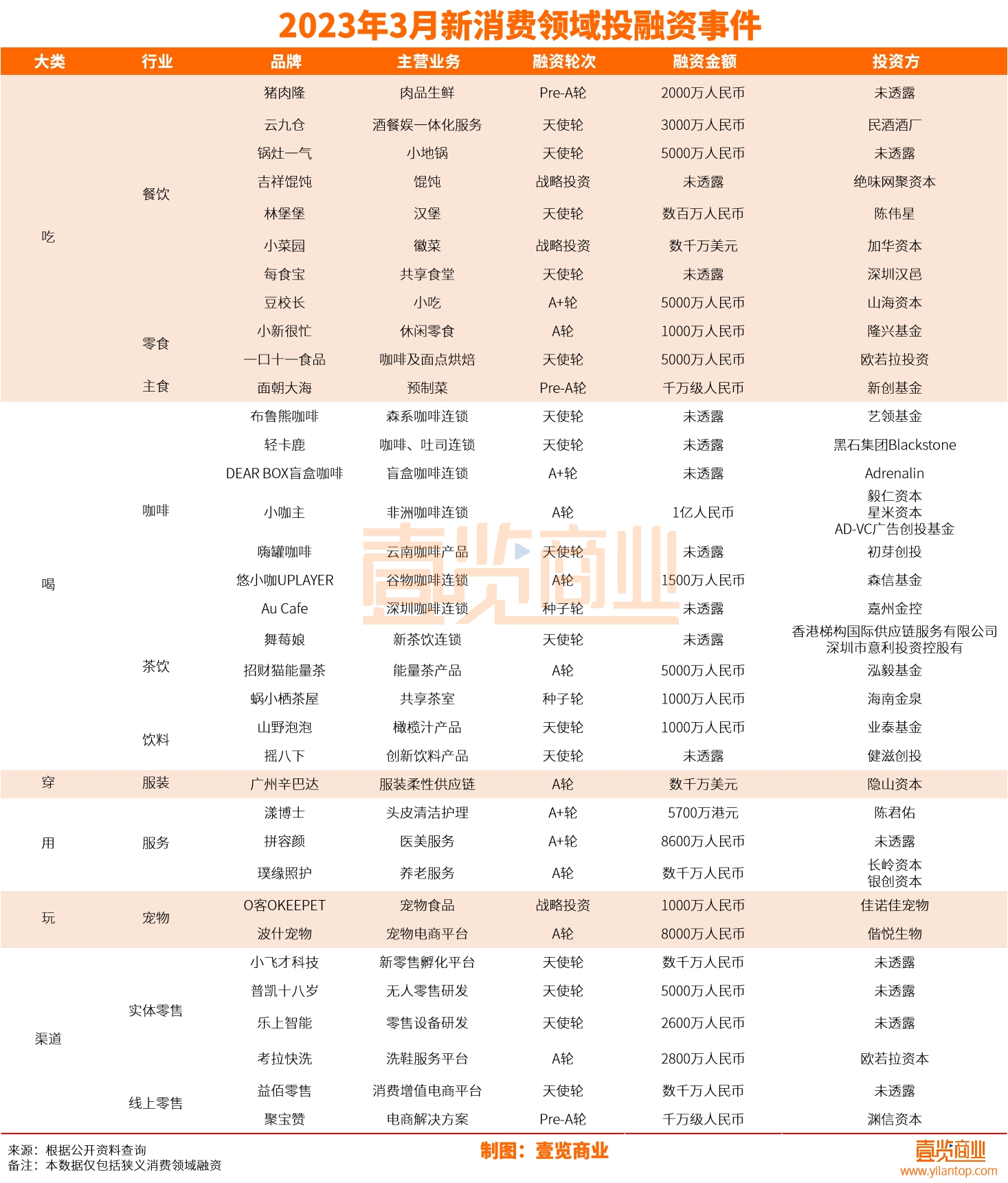 3月份,“吃”大類一共融資11起,4.24億元。其中咖啡及面點烘焙品牌“一口十一食品”獲得一筆5000萬元的天使輪投資。