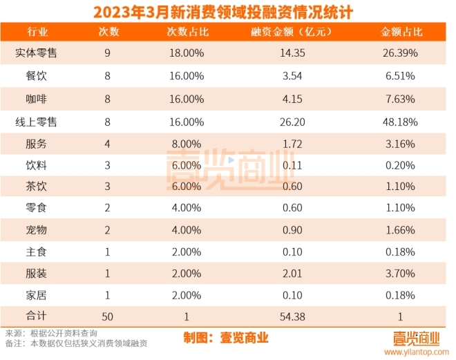 據壹覽商業(yè)不完全統計,3月新消費領域共發(fā)生50起融資事件,融資金額54.38億元。與2月份相比,融資數量減少1起,環(huán)比減少1.96%;融資金額增加14.58億元,環(huán)比增加36.64%。