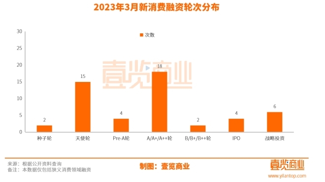 從融資輪次來看,3月份的新消費融資主要集中在天使輪與A輪系列,其中天使輪發(fā)生15起,占比30%;A輪系列一共發(fā)生18起,占比36%。A輪及之前階段的早期融資一共發(fā)生39起,占比78%。