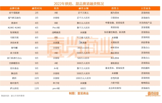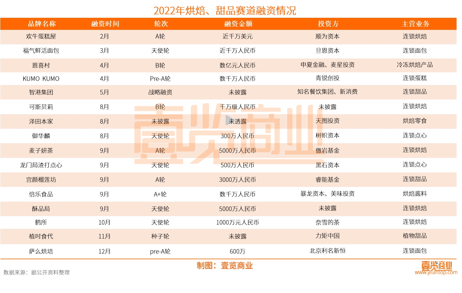 在過去三年間,烘焙可謂是新消費行業(yè)的明星賽道,無數的熱錢涌入這個行業(yè)。據壹覽商業(yè)不完全統計,2022全年有16個烘焙、點心相關的品牌獲得融資。高毛利、可復制、自帶萬店基因、深受年輕人追捧,這些特質讓烘焙品牌賺夠了投資人的目光。更有甚者,只開了幾家店,估值已達百萬。