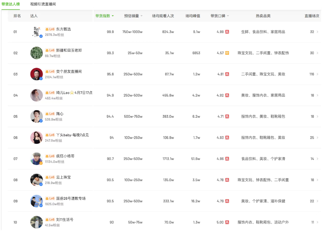 我們先來看抖音直播電商TOP10主播排行榜的情況: