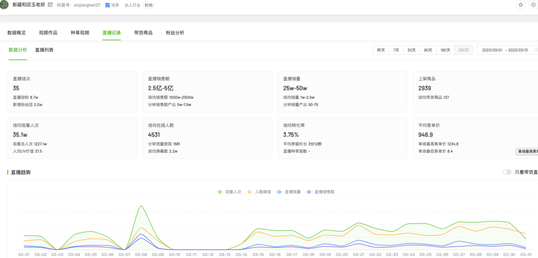 看起來,場(chǎng)均直播銷量變化不大,仍然在750萬到1000萬,但其實(shí),如果在飛瓜數(shù)據(jù)上拉開連續(xù)90天的直播業(yè)績,可以很明顯的看到從1月份到3月份的下滑趨勢(shì)。