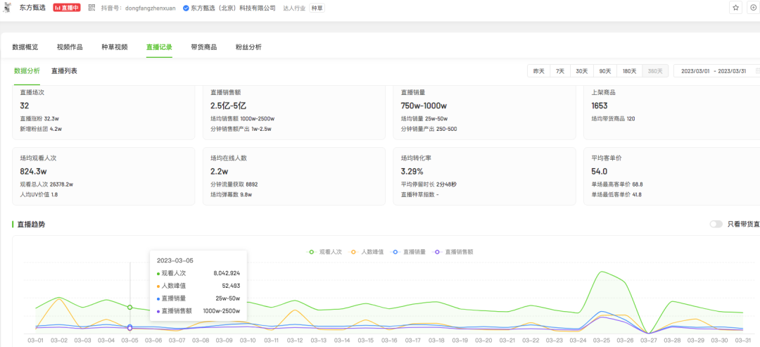 要知道,三月份比二月份還多出了三天,商品數(shù)量增加了170多個(gè),對(duì)于日播17個(gè)小時(shí)的東方甄選來說,這三天應(yīng)該賣5000萬左右,但現(xiàn)實(shí)情況是,東方甄選3月份業(yè)績沒能超過5億: