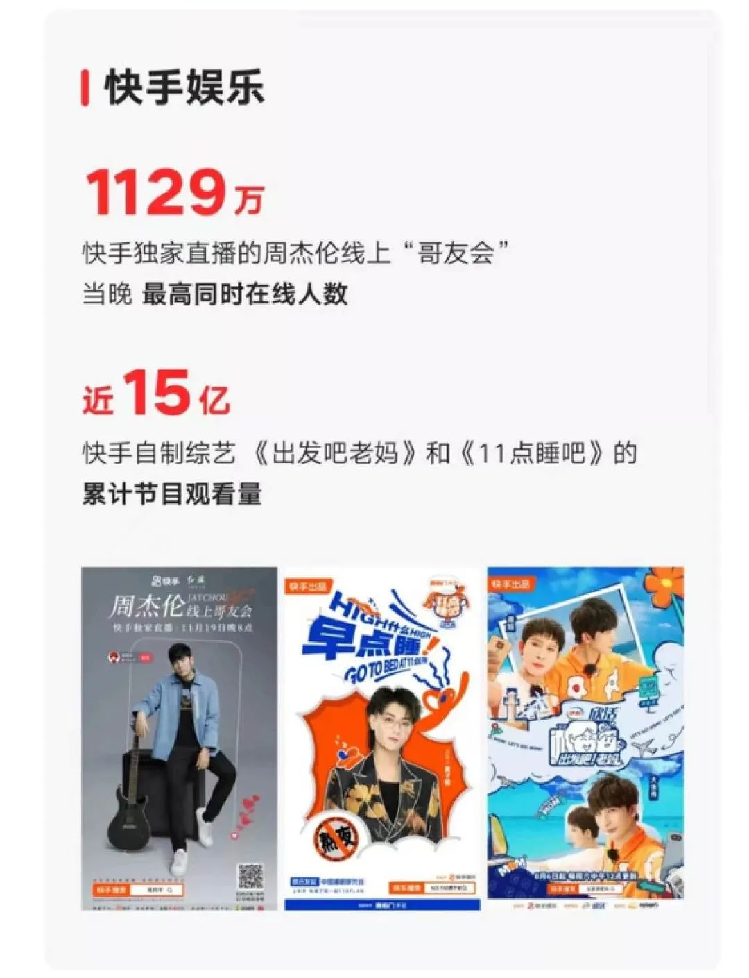 在知識內(nèi)容垂類,快手推出了泛知識IP“快手新知”,目前已經(jīng)覆蓋教育、人文、藝術和科學等10余個領域。2022第四季度,媒體機構提供的資訊相關視頻上傳量同比實現(xiàn)超翻倍增長;綜藝方面,爆款內(nèi)容也有利于獲取新用戶,例如2022年11月舉辦的周杰倫線上哥友會,最高同時在線人數(shù)超1129萬,點贊總數(shù)超11億。