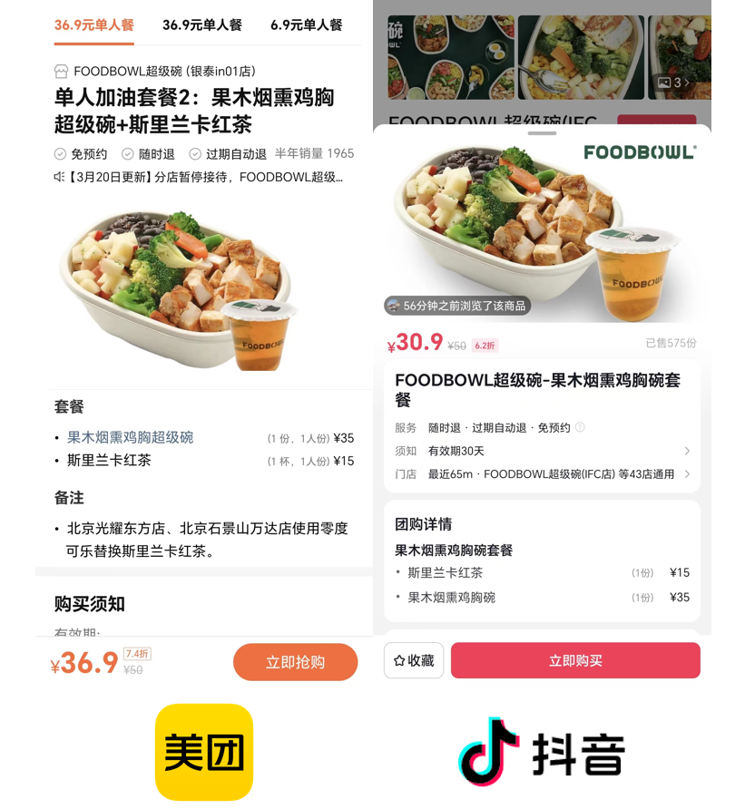 部分商家在兩個平臺提供的套餐價(jià)格差異巨大。例如超級碗的果木煙熏雞胸碗套餐,抖音售價(jià)30.9元,在美團(tuán)售價(jià)為36.9元,比抖音貴近20%。