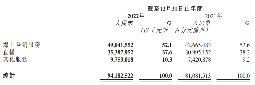 內(nèi)容平臺營收的主要來源是廣告和直播打賞抽成。抖音未正式對外公布營收相關(guān)數(shù)據(jù),快手財(cái)報(bào)則顯示,其2022年線上營銷服務(wù)收入占比為 53.4%,直播業(yè)務(wù)收入占比為 35.5%。