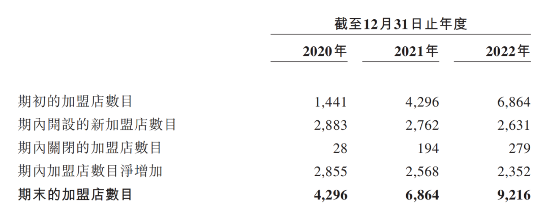 招股書顯示,其來自加盟店的產(chǎn)品銷售額由2020年的29.1億元增至2021年的37.28億元,增幅28.1%。并進一步增幅73.7%至2022年的64.77億元,分別占總收入的98.2%、94.2%及90.3%。