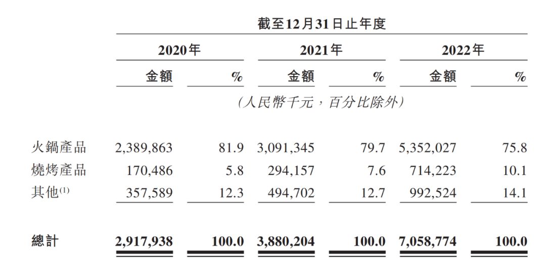 火鍋產(chǎn)品仍占據(jù)總銷售額的大部分,2020年-2022年,火鍋占總銷售百分比分別為:81.9%、79.9%、75.8%。燒烤與其他產(chǎn)品為:18.1%、20.3%、24.2%。