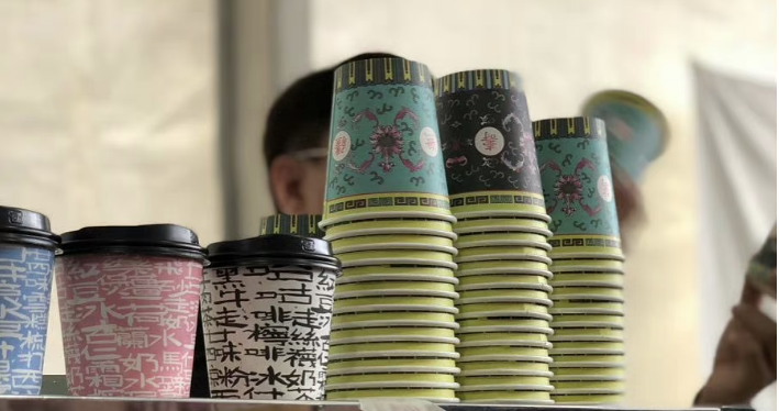 最受歡迎的“萬壽無疆”茶樓杯,還制作成了外帶紙杯,三個顏色組成一套,賣外帶客人,走在街上一看就知道是“半路咖啡”。