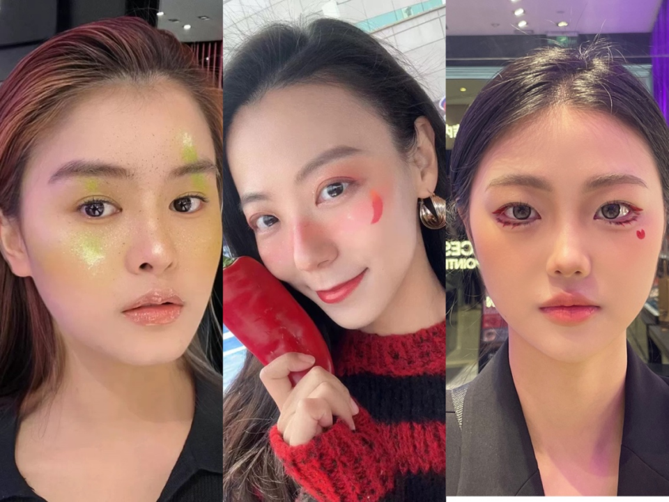 城市美食妝容依次:杭州蔥包燴妝、西安油潑辣子妝、武漢小龍蝦妝