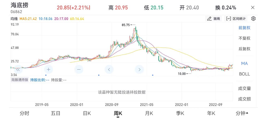 2021年2月,海底撈摸到了85.75港幣的高點(市值突破4000億),一年后跌至10港幣,跌幅88%;