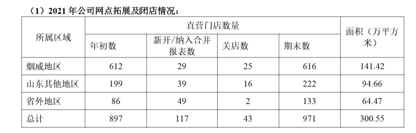 與此同時(shí),從2020年到2021年,家家悅開(kāi)始了大規(guī)模開(kāi)店,平均每年開(kāi)出了近100家店,在2021年門店數(shù)量達(dá)到971家。