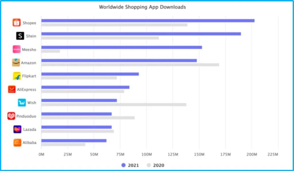 根據(jù)市場研究機(jī)構(gòu)Apptopia數(shù)據(jù),Shopee為2021年全球下載量最高的購物App,Lazada排名第九。