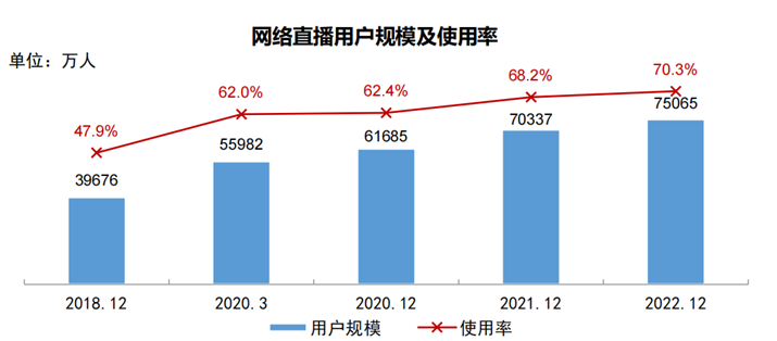 用戶方面,截至2022年12月,短視頻用戶規(guī)模達10.12億,同比增長 7770 萬,增長率為 8.3%,在整體網(wǎng)民中的占比為94.8%,網(wǎng)絡直播用戶規(guī)模為7.51億,是僅次于短視頻的網(wǎng)絡視聽第二大應用。