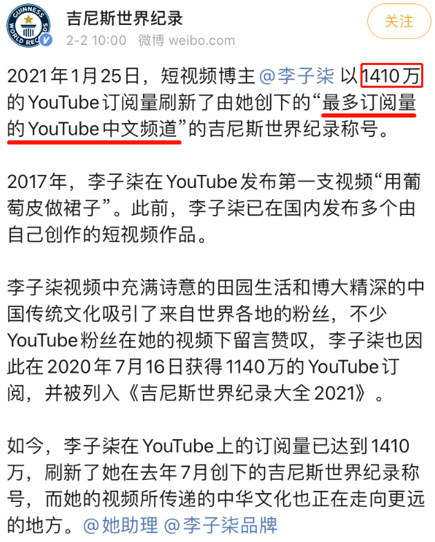 2021年,李子柒打破吉尼斯世界記錄,成為“訂閱量最多的YouTube中文頻道”的記錄保持者。