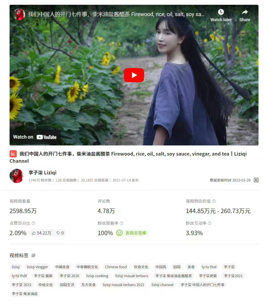 截至目前,李子柒在油管上擁有1740萬粉絲,總共發(fā)布了128個視頻,總播放量約29.2億次。其中,最新發(fā)布的一條視頻播放量近2600萬,評論約4.8萬,點贊超54萬。