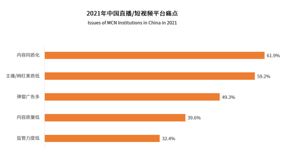 有數(shù)據(jù)顯示,61.9%的用戶認為短視頻平臺存在內(nèi)容高度同質(zhì)化的問題;認為主播、網(wǎng)紅素質(zhì)低的用戶占比59.2%。