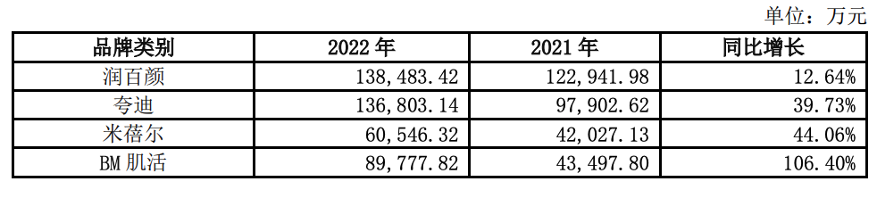 華熙生物已經(jīng)建立較為均衡的品牌矩陣:繼潤百顏在2021年突破10億銷售額后,夸迪也在2022年做到了13.68億的收入;去年做到8.98 億的BM肌活,應(yīng)該也會在今年邁入10億門檻。