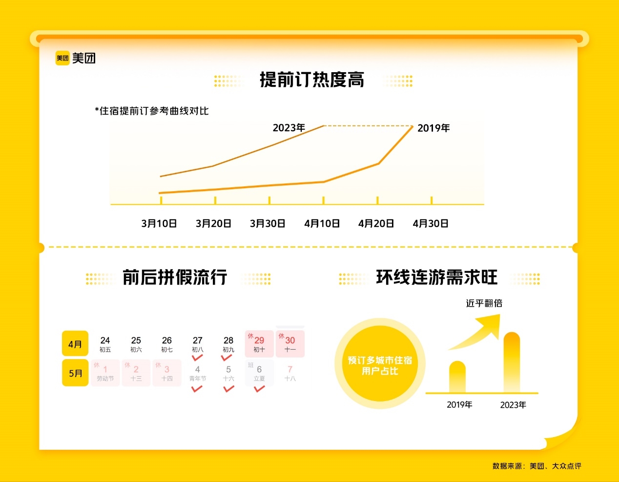 美團、大眾點評數(shù)據(jù)顯示,截至4月10日,五一期間國內(nèi)的住宿、交通、景點門票等預(yù)訂量較2019年同期增長約200%,住宿預(yù)訂潮更是提早了兩周。此外,山東或成五一新“頂流”,中國香港和澳門則領(lǐng)跑出境游熱度。旅游市場參與方也正在合力提供“又好又省”的旅游產(chǎn)品,共同提振旅游經(jīng)濟,激活消費動力。