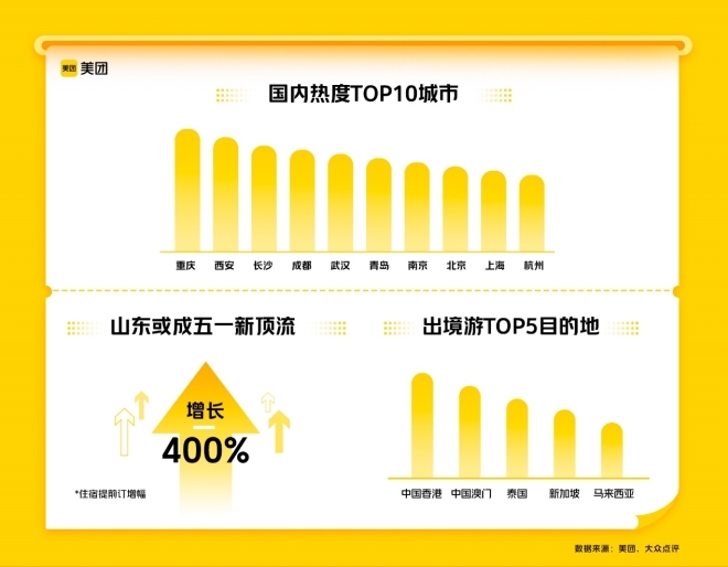 綜合美團上住宿、景區(qū)、交通等旅游相關(guān)訂單,重慶、西安、長沙、成都、武漢、青島、南京、北京、上海、杭州,成為國內(nèi)熱度最高的十大目的地城市;從出發(fā)地來看,北京、上海、成都、重慶、武漢的人群出游熱情更為高漲。