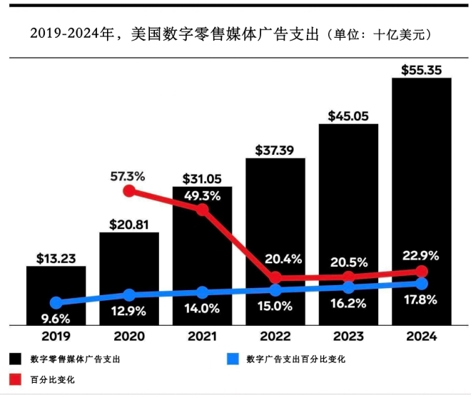據(jù)eMarketer數(shù)據(jù),零售商的廣告收入已逼近廣播和平面媒體廣告收入總和之兩倍,與電視媒體的收入差距也在迅速縮小,而2022年電視全年廣告收入預(yù)計將達680億美元。